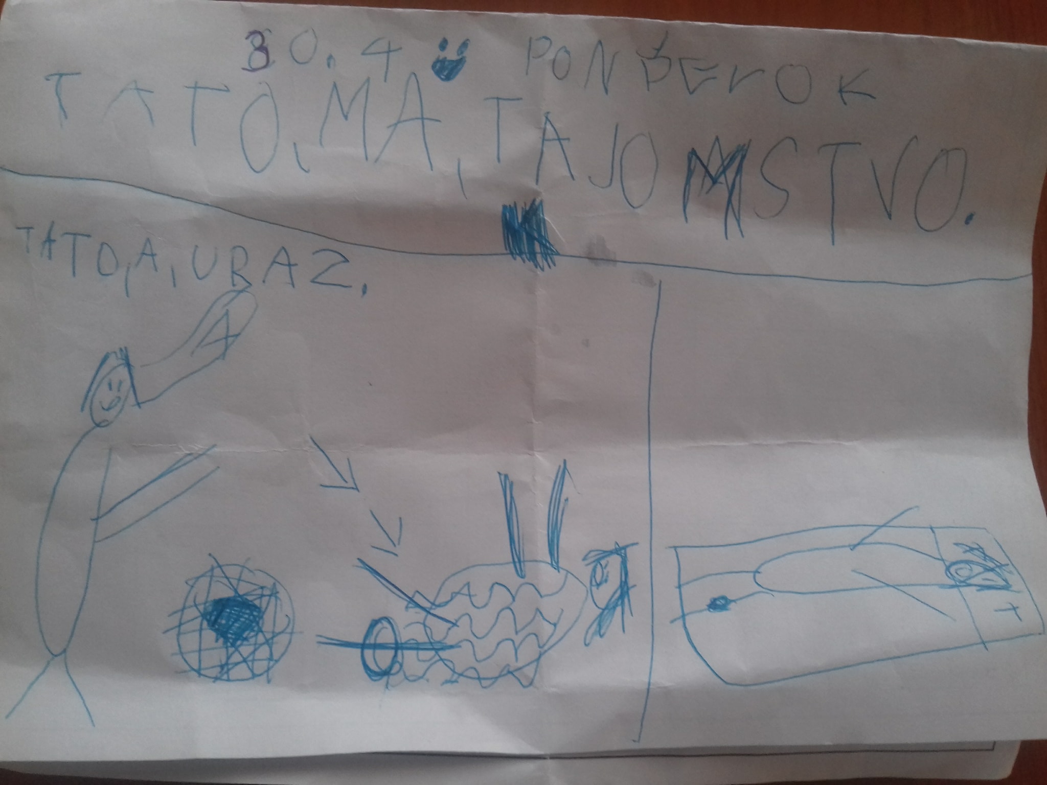 7 ročné dievčatko sľúbilo svojmu tatinovi, že nikomu nepovie, ako prišiel k úrazu. Keď sa jej opýtala mama Monika, čo sa mu stalo, dcéra tajomstvo nepovedala, no nakreslila.