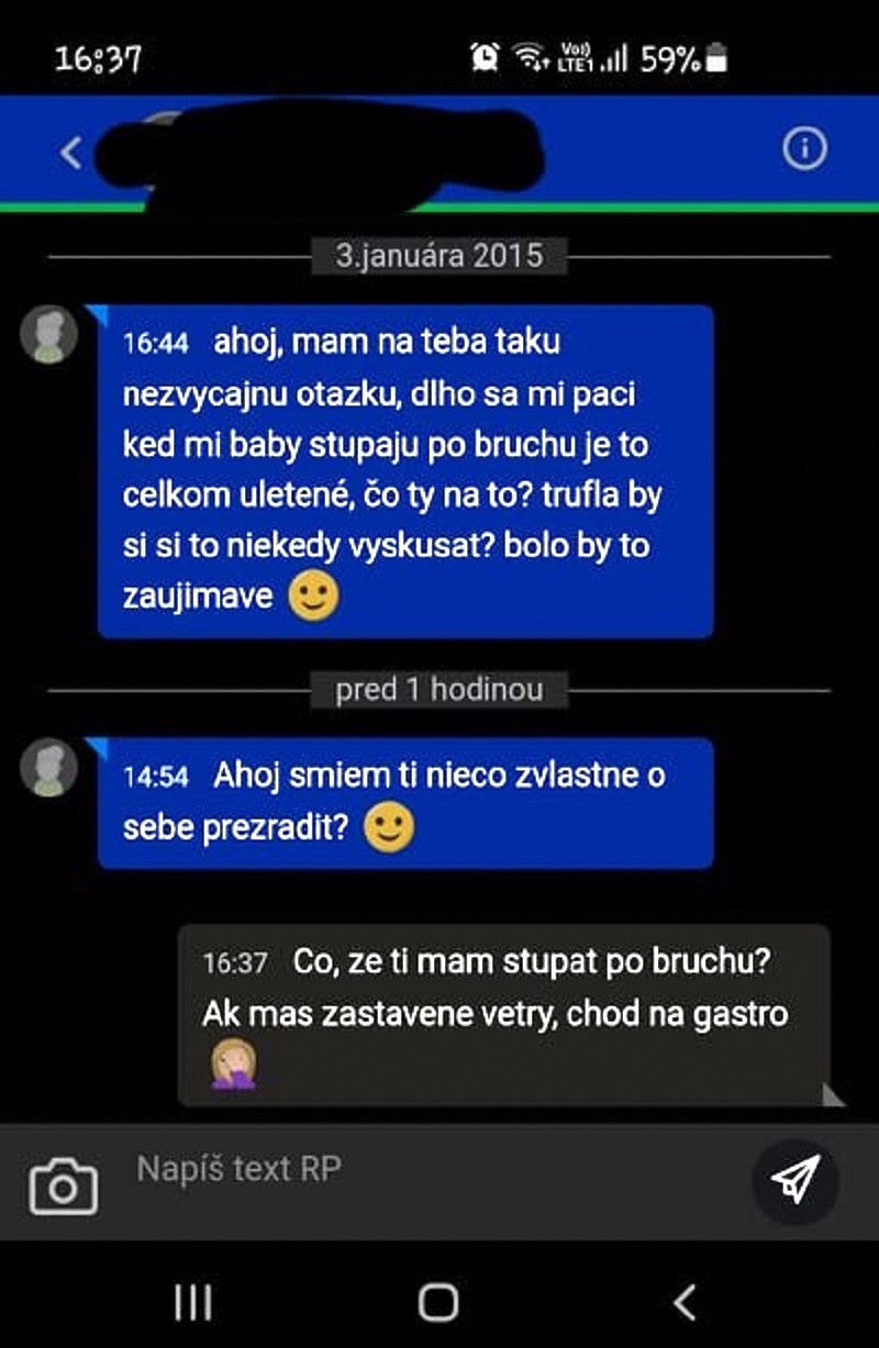 „Zdravím a pekný deň želám. Posielam vám sken obrazovky, kde nepochodil mladý muž pred piatimi rokmi u mňa a teraz som už odpísala... POKEC nikdy neprestane baviť alebo udivovať.“